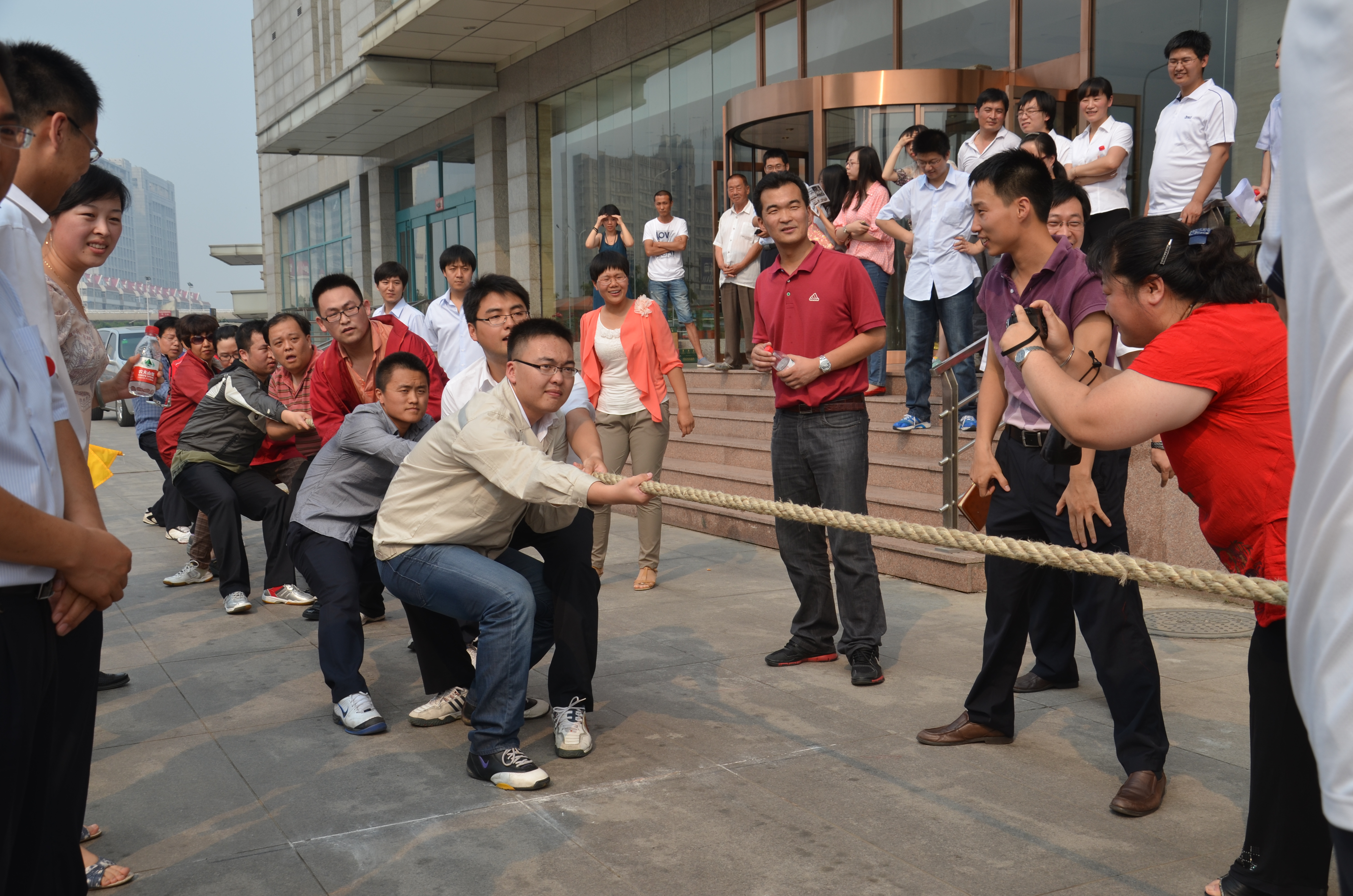 下午三點整,各隊隊員在比賽地集合,蓄勢待發(fā)。隨著主裁判比賽哨聲的吹響,比賽現(xiàn)場立刻沸騰起來。參賽隊員們都卯足了勁,氣勢如虹,團結(jié)一心,拼盡全力把繩上的紅標往自己方向拉。各參賽隊組成的啦啦隊加油聲此起彼伏,震耳欲聾,現(xiàn)場氣氛緊張而熱烈。實力懸殊較大的隊伍瞬間即分出勝負,而實力相當?shù)年犖閯t僵持許久,最終耐力和毅力俱佳的隊伍取勝。