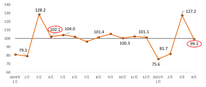 The Building Materials Industry Prosperity Index (MPI) for April 2025 was 99.3 points, falling below the threshold and down 27.9 points from March, indicating non-prosperous conditions and weaker performance compared to the same period last year. Influenced by factors such as U.S. tariff increases and domestic and international market conditions, production of building materials and related downstream industrial products weakened, causing the MPI to drop into the non-prosperous range.